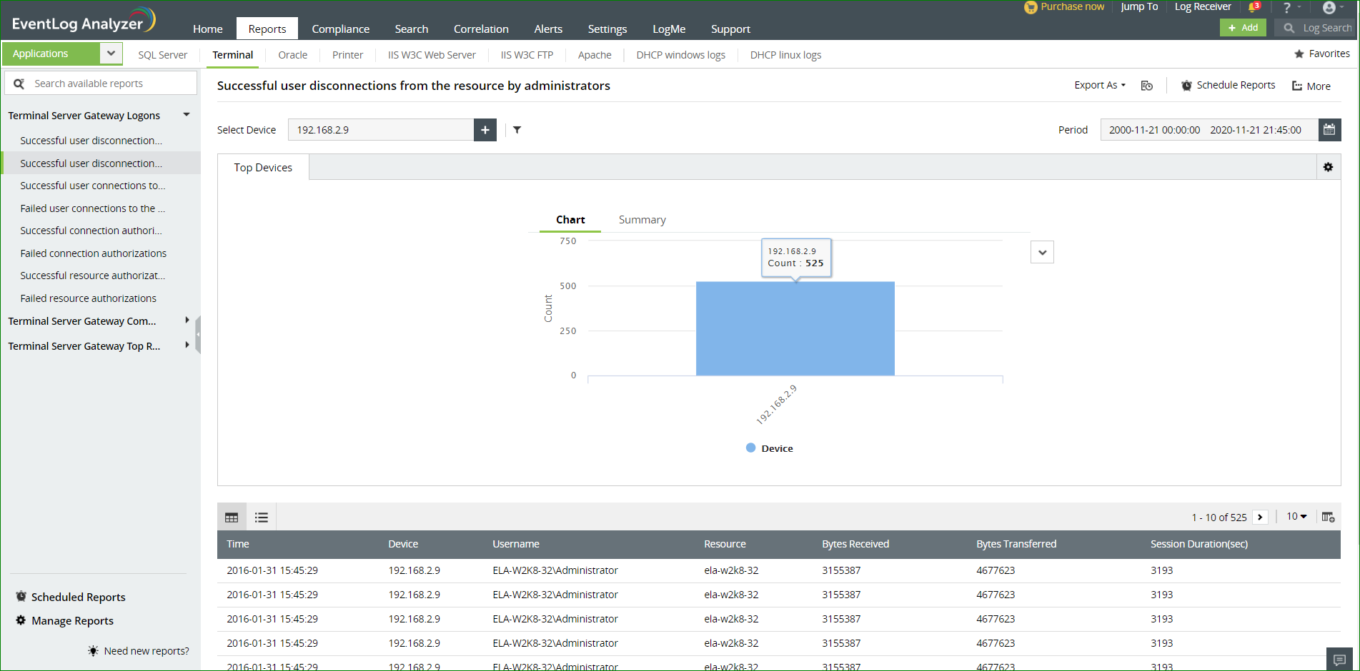 Met EventLog Analyzer kunt u rapporten over gebruikersactiviteiten die plaatsvinden op uw externe Windows-desktopservices bewaken en genereren door de logboekgegevens van de terminal server in realtime te bewaken en te analyseren. Het product analyseert de tijd die gebruikers doorbrengen in elke externe verbindingssessie, welke gebruikers zijn aangemeld bij de server, tot welke bron toegang is verkregen, toestemming is verleend aan de gebruikers, of de gebruiker met succes verbinding heeft gemaakt met de bron, en meer.