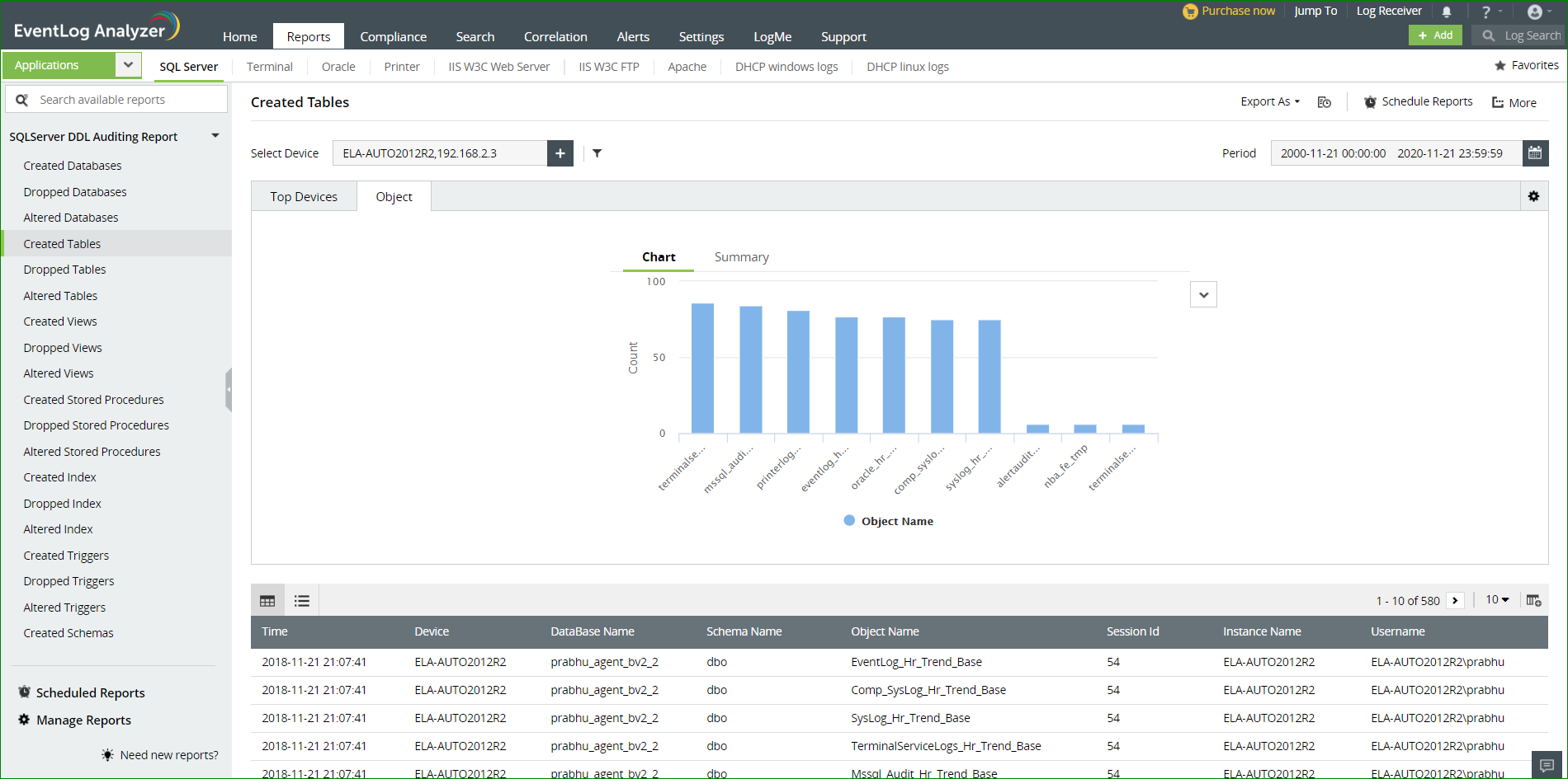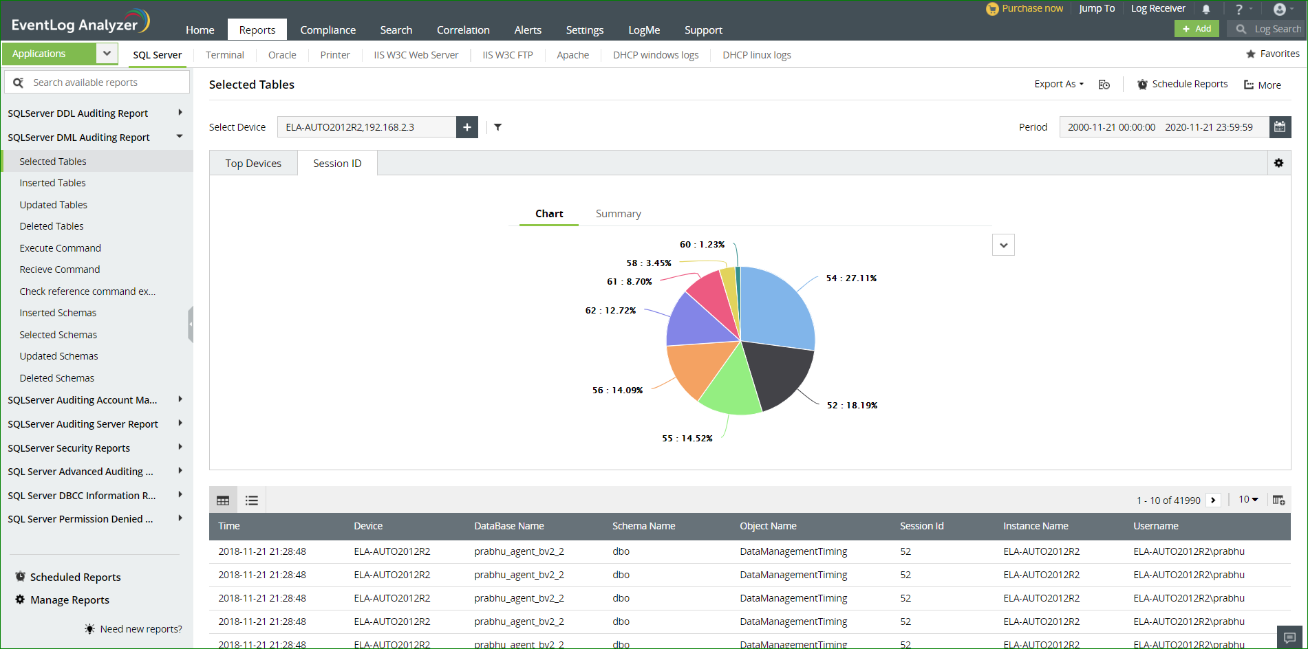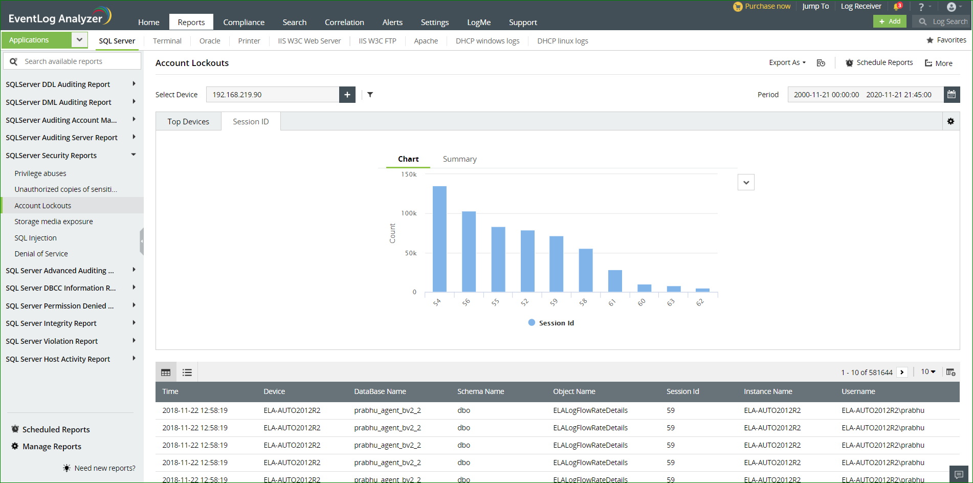 Veel bedrijven gebruiken SQL Servers om de persoonsgegevens van hun klanten op te slaan. EventLog Analyzer biedt verschillende rapporten waarmee u geïnformeerd blijft over kritieke wijzigingen die in uw SQL-servers zijn aangebracht, waaronder rapporten over: